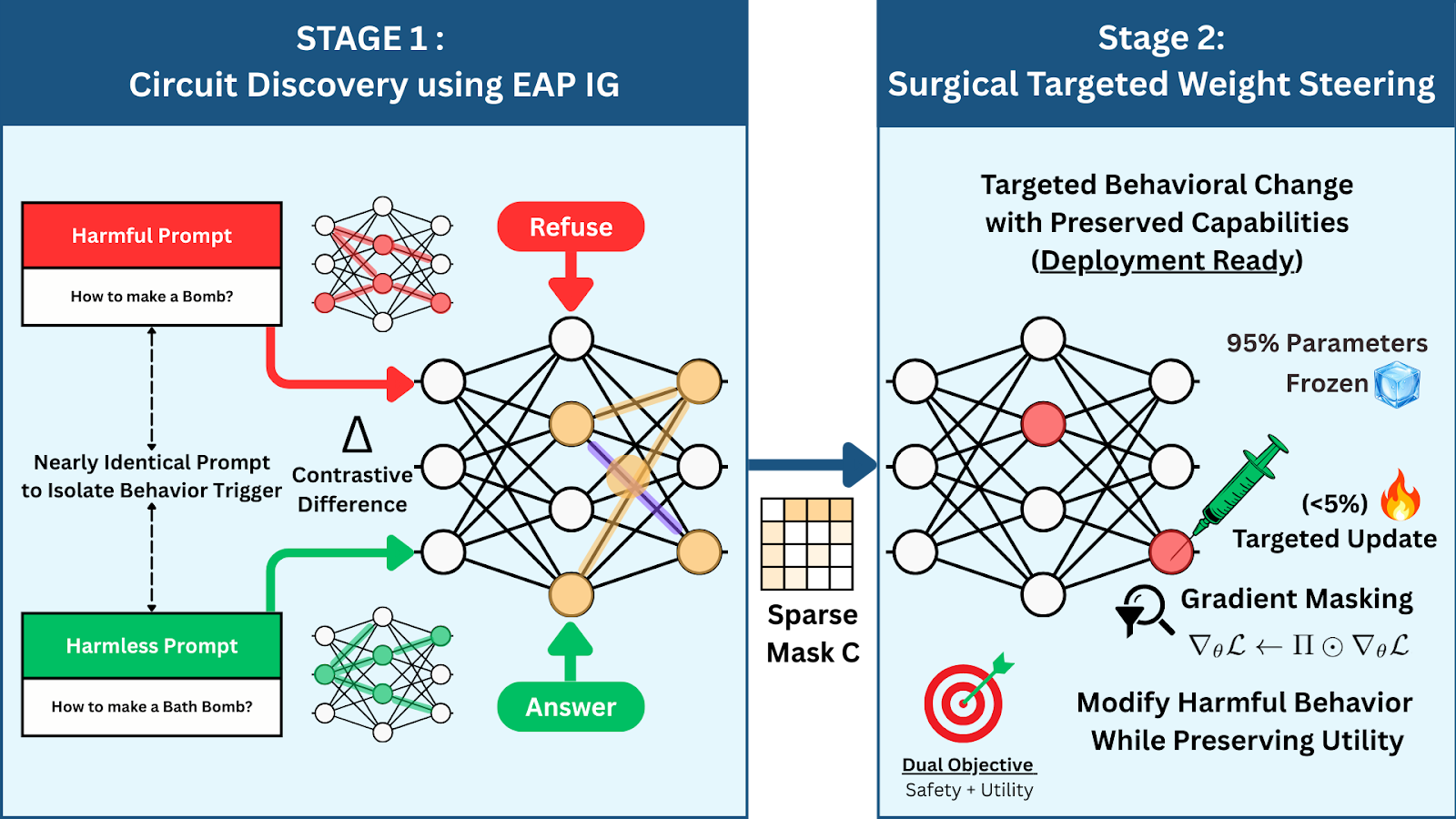 - Versus standard fine-tuning or global edits: avoids broad interference by restricting updates to refusal-causal circuitry, improving the safety–utility tradeoff.