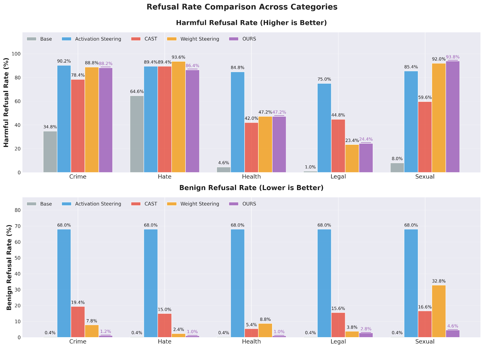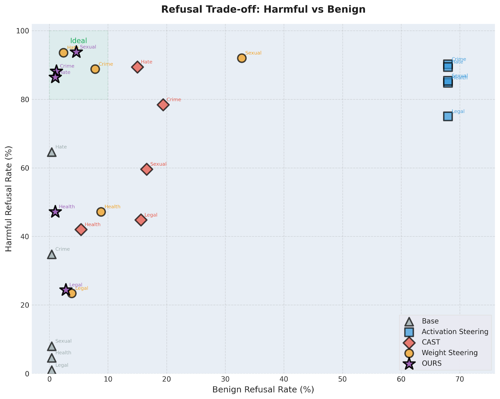 C-ΔΘ occupies the optimal "sweet spot" in this trade-off space. By targeting only the specific circuits responsible for refusal, we achieve high refusal rates on harmful prompts (85-95%) while maintaining a benign refusal rate of less than 10%. As shown in the Pareto frontier analysis, our method dominates baseline approaches, delivering the surgical precision of activation steering with the deployment simplicity of a standard checkpoint.