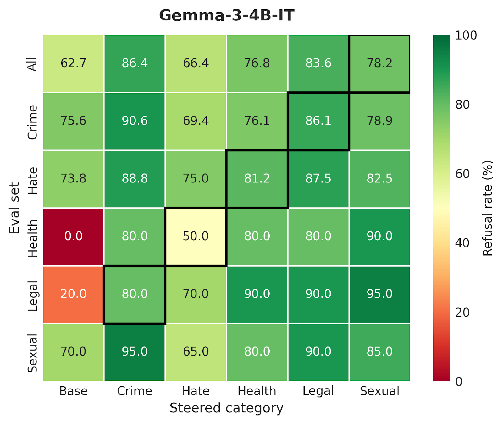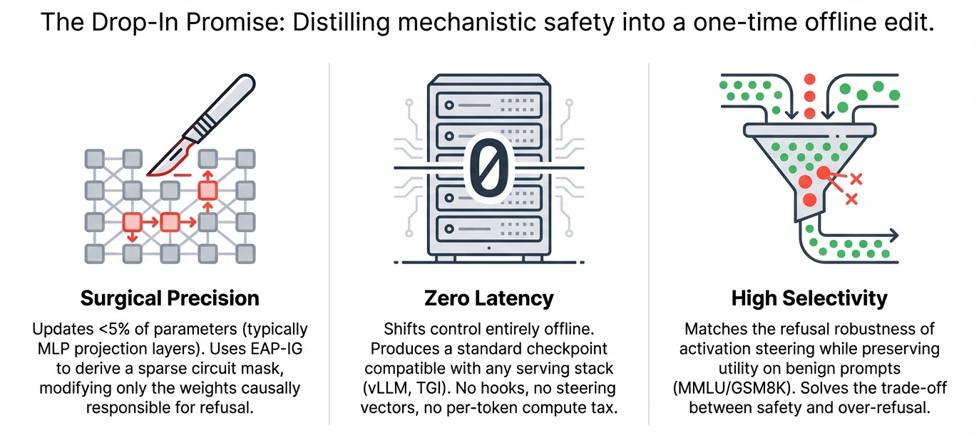 More concretely, can mechanistic understanding of category-specific refusal be distilled into a deployment-ready checkpoint update that requires no inference-time hooks?