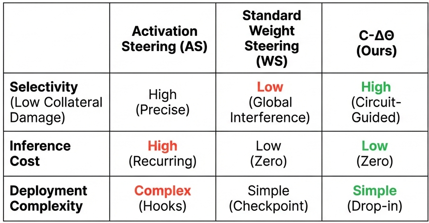 - Versus activation steering: retains precision while eliminating runtime cost and inference-time control surfaces.