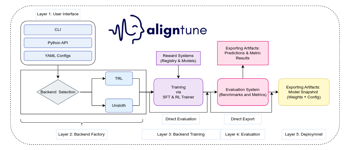 - AI engineers shipping product-grade LLM workflows: If you’re an AI engineer responsible for reliability, latency, cost, and integration constraints, AlignTune helps turn post-training into an engineering loop: train → evaluate → compare → deploy, without rewriting pipelines across methods. It’s designed for teams who want the model to carry more of the workflow structure in the weights, reducing prompt scaffolding and downstream patchwork.