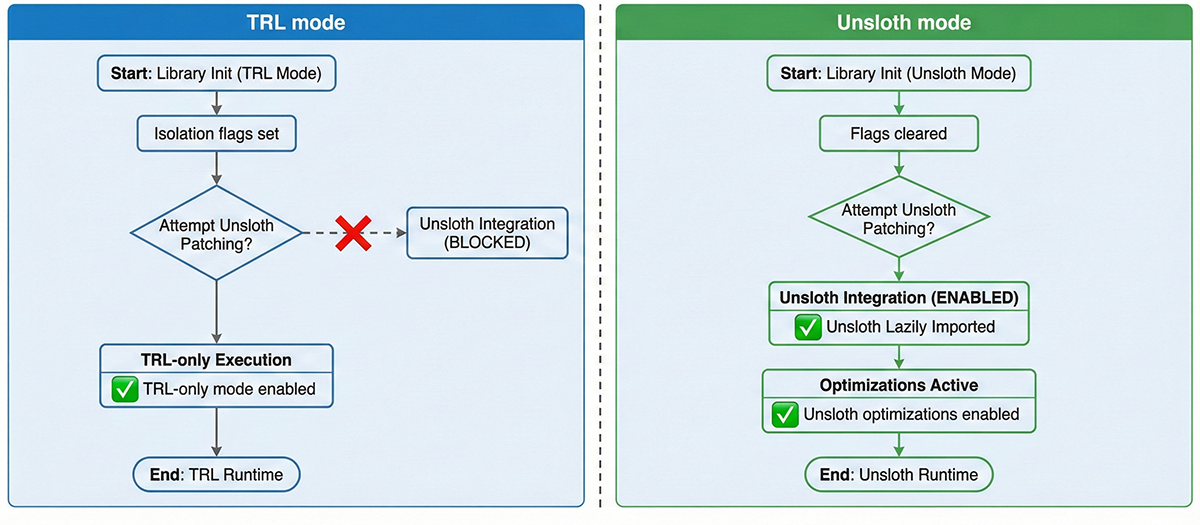 - Backend purity over implicit speedups. Isolation ensures backend selection is explicit and free of hidden side effects. Supporting both TRL and Unsloth lets users trade off reliability and speed without switching toolchains.